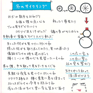 自主制作アルバムとほぼ同時期に発売した2曲入りのマキシ。 カップリングにYossy作曲の窓の外の世界を収録。 アルバムFlowerを購入すると、応募券が添付されており、 応募すれば抽選で10名にこのマキシの別バージョンをプレゼントした。 別バージョンには冬のサイクリングというサイクリングの歌詞が 冬バージョンになっているものが収録されている。
